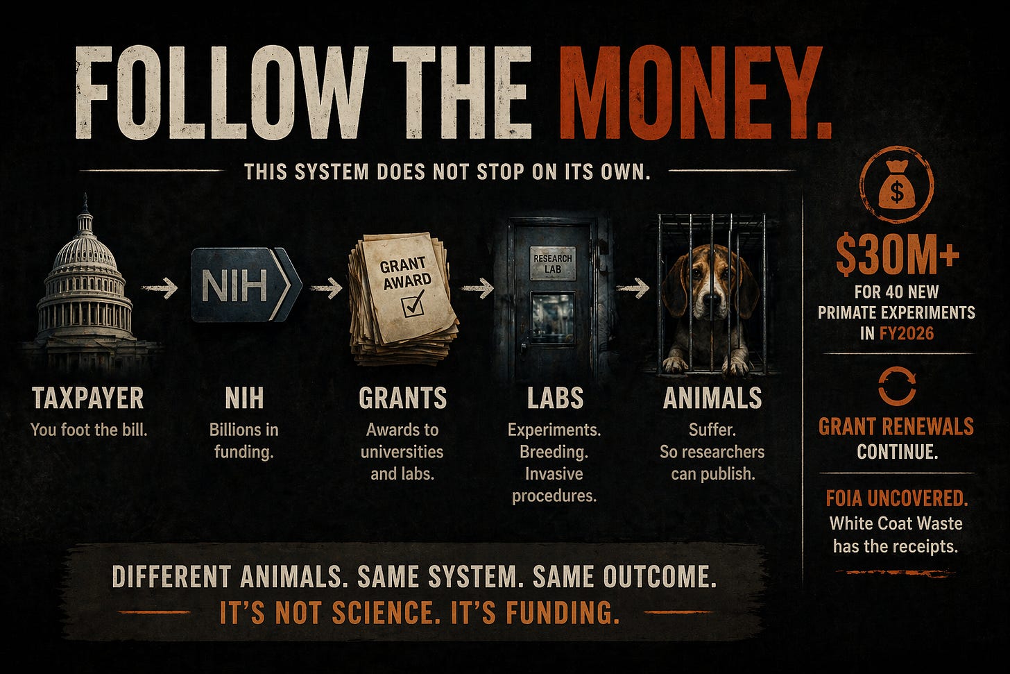 This is a piece about the people underneath him still cutting the checks. The career bureaucrats at NIH. The university grant recipients. The pharmaceutical companies running toxicity tests on puppies bought from a mill. The system that keeps renewing grants on autopilot while the press conference happens upstairs.