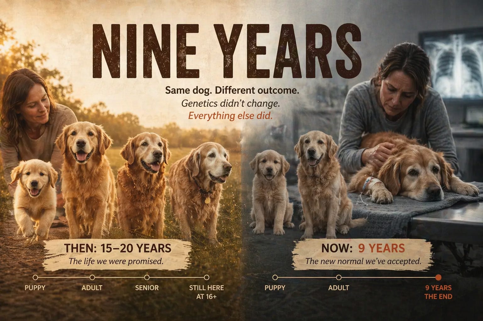 The biology of these animals has not changed in fifty years. Their genetics are the same. What changed is everything around them. The food. The vaccine schedules. The pharmaceutical load. The environmental toxins. The economic incentives quietly shaping what your vet recommends in the exam room.